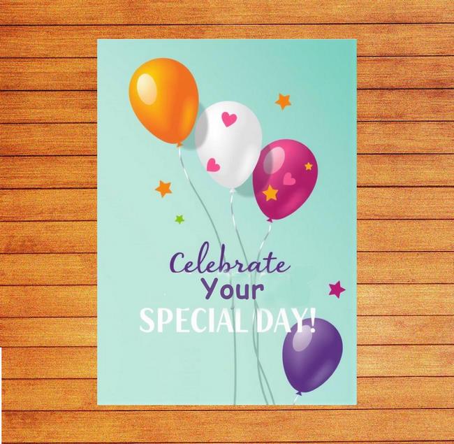 Celebrate your special day Greeting card. Size, 148 x 210 millimetres. Please include the exact greeting you want inside by including it in the text box above- we will handwrite this for you. Also include the name and address of the person you wish to send it to