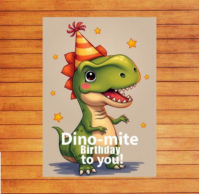 Dinomite birthday to you Greeting card. Size, 148 x 210 millimetres. Please include the exact greeting you want inside by including it in the text box above- we will handwrite this for you. Also include the name and address of the person you wish to send it to