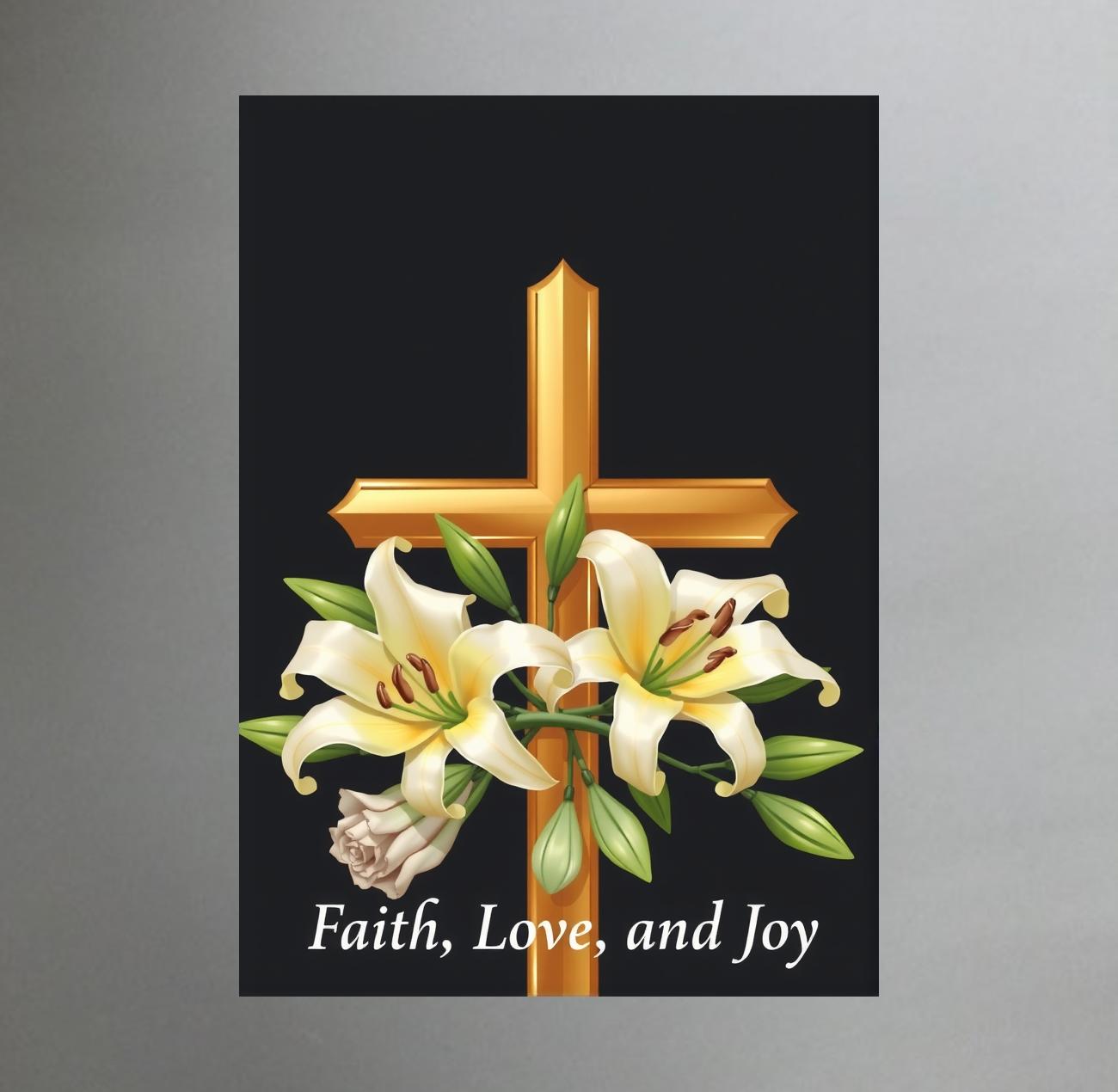Faith love and joy Greeting card. Size, 148 x 210 millimetres. Please include the exact greeting you want inside by including it in the text box above- we will handwrite this for you. Also include the name and address of the person you wish to send it to