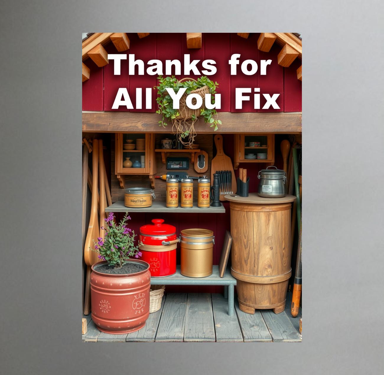 Thanks for all you fix Greeting card. Size, 148 x 210 millimetres. Please include the exact greeting you want inside by including it in the text box above- we will handwrite this for you. Also include the name and address of the person you wish to send it to