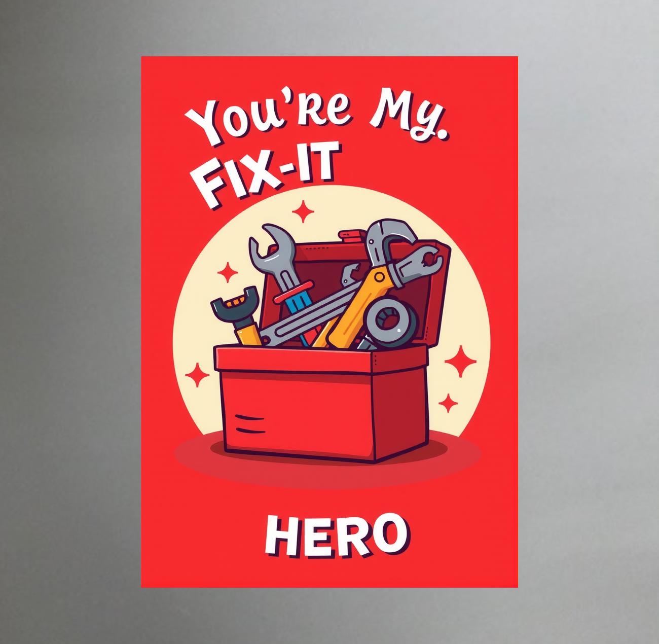 Your my fix it hero Greeting card. Size, 148 x 210 millimetres. Please include the exact greeting you want inside by including it in the text box above- we will handwrite this for you. Also include the name and address of the person you wish to send it to